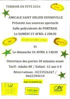 Du 25 au 26 avril 2026L'Amicale SAINT-HELIER de DENNEVILLE vous propose Son Nouveau Spectacle, une pièce Comique dans le cadre de Terroir en Fête 2026 A PORTBAIL - Salle Polyvalente SAMEDI 25 AVRIL à 20h30 Dimanche 26 AVRIL à 14h30 Adultes 8 € - Enfants 4 € (Moins de 12 ans) Réservations au 02 33 52 62 67 ou 06 62 20 46 10 Organisé par l'association Amicale Saint-Helier |
